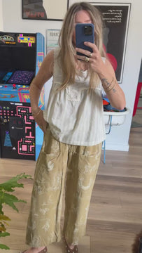 Step into Western charm with these Lulu Western Wide Leg Pants, where vintage cowboy aesthetics meet modern comfort. Adorned with playful illustrations of boots, hats, cacti, and horseshoes throughout, these pants bring personality to your wardrobe. The structured creased fabric adds dimension, while practical front patch pockets keep essentials within reach. An elastic back waistband with button tab detailing ensures a relaxed yet put-together fit. Perfect for anyone craving that effortless, trendy vibe—stylish enough to turn heads, comfy enough to wear all day.