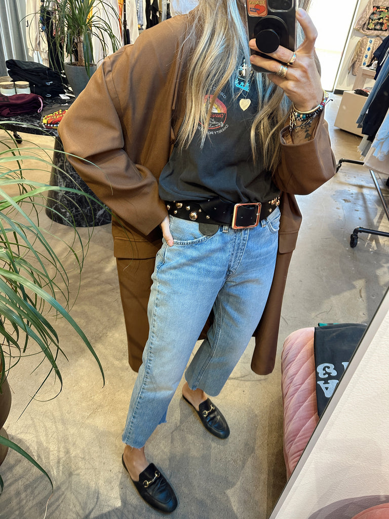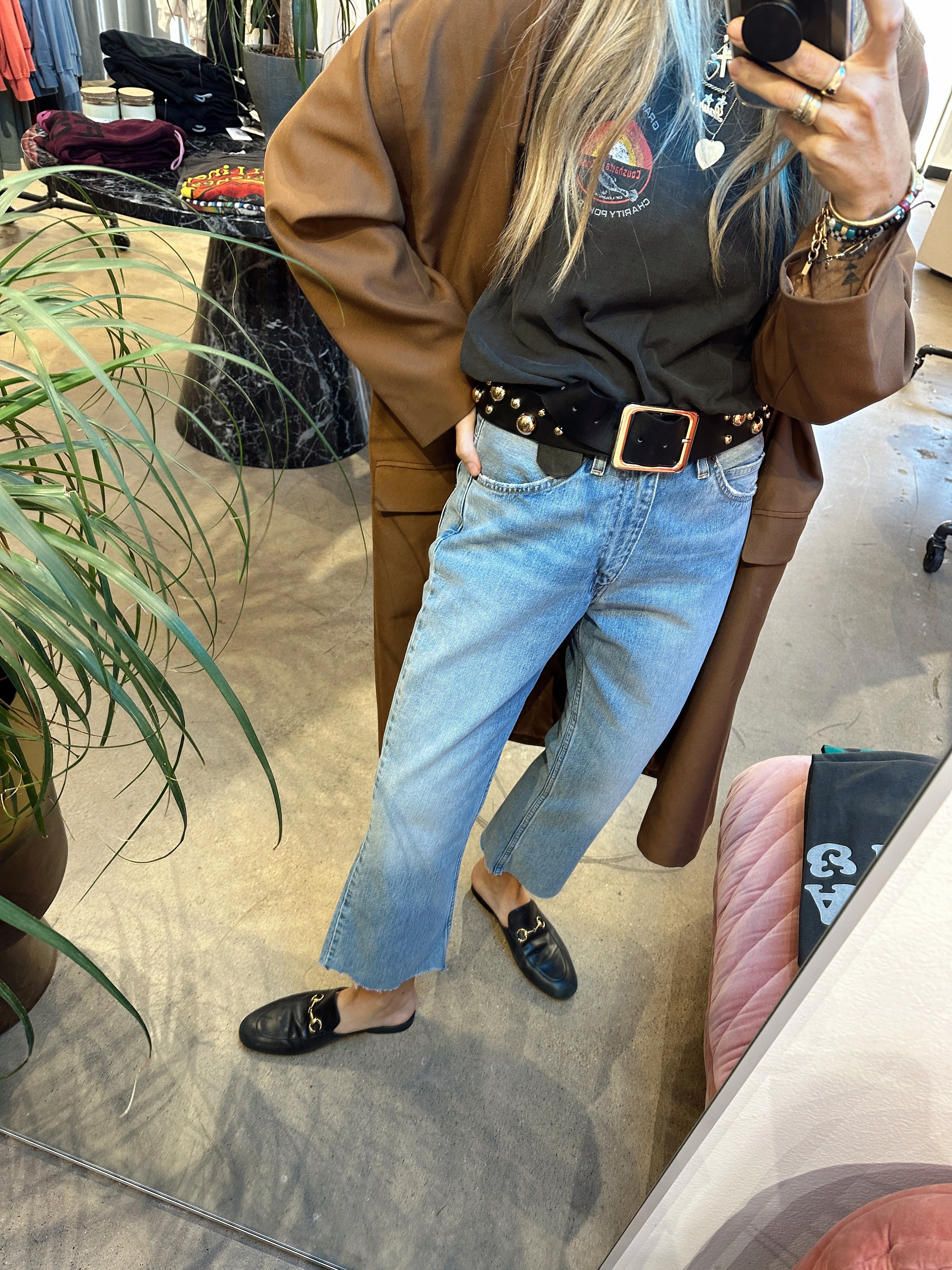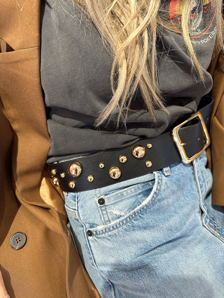 The Bella Bubble Belt has a width of 1 7/8 inches, making it incompatible with the majority of belt loops. Nevertheless, the belt is a fashionable and ideal accessory.