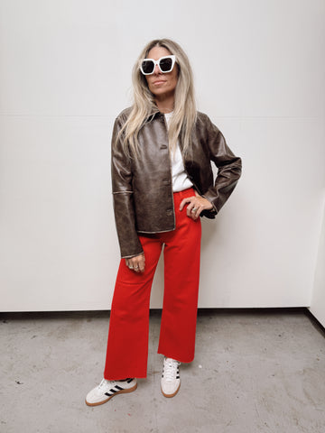 The Murph Jacket is a distressed leather jacket with a vintage look. Designed with front pockets for practicality, this jacket blends edgy aesthetics with functional fashion, making it a versatile layering piece to elevate your wardrobe.