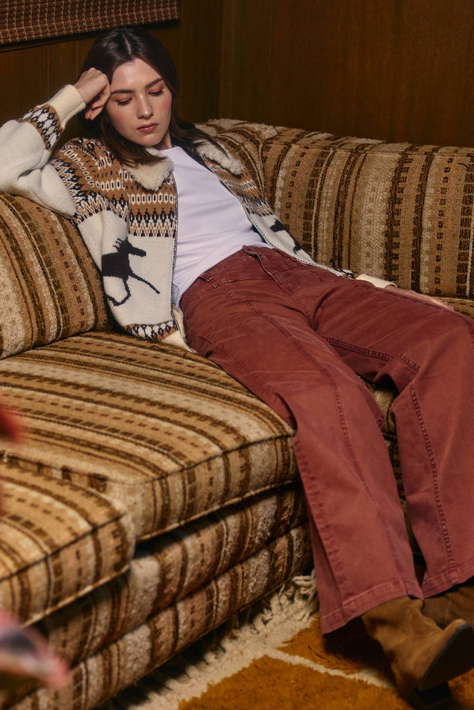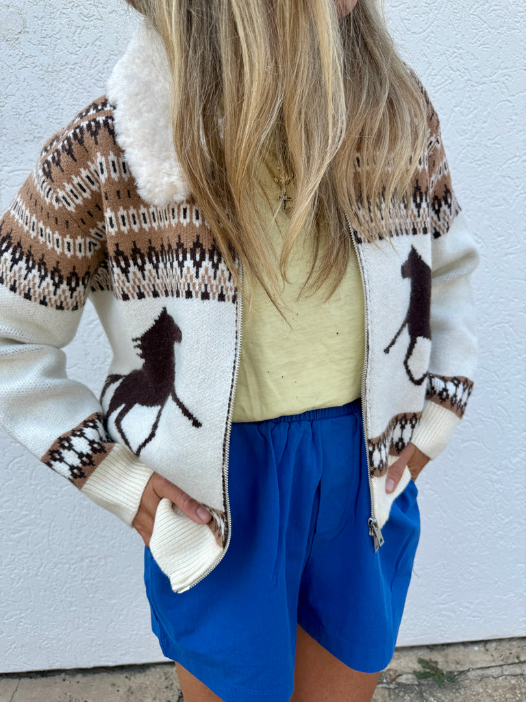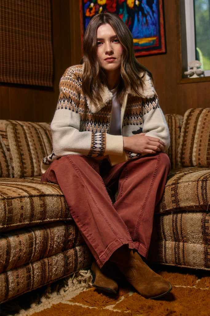 The Loretta Jacket is your new cozy companion, featuring a fun Western-inspired horse silhouette woven into an earthy jacquard knit. It’s topped with a plush faux shearling collar that adds extra warmth and a touch of style.