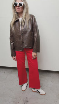 The Murph Jacket is a distressed leather jacket with a vintage look. Designed with front pockets for practicality, this jacket blends edgy aesthetics with functional fashion, making it a versatile layering piece to elevate your wardrobe.