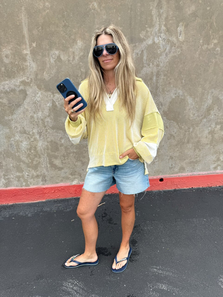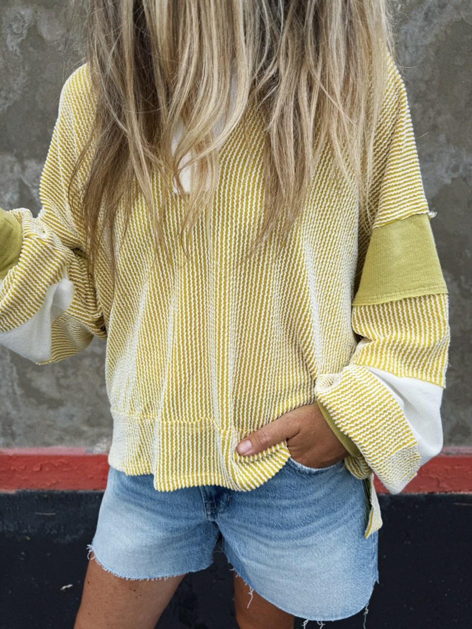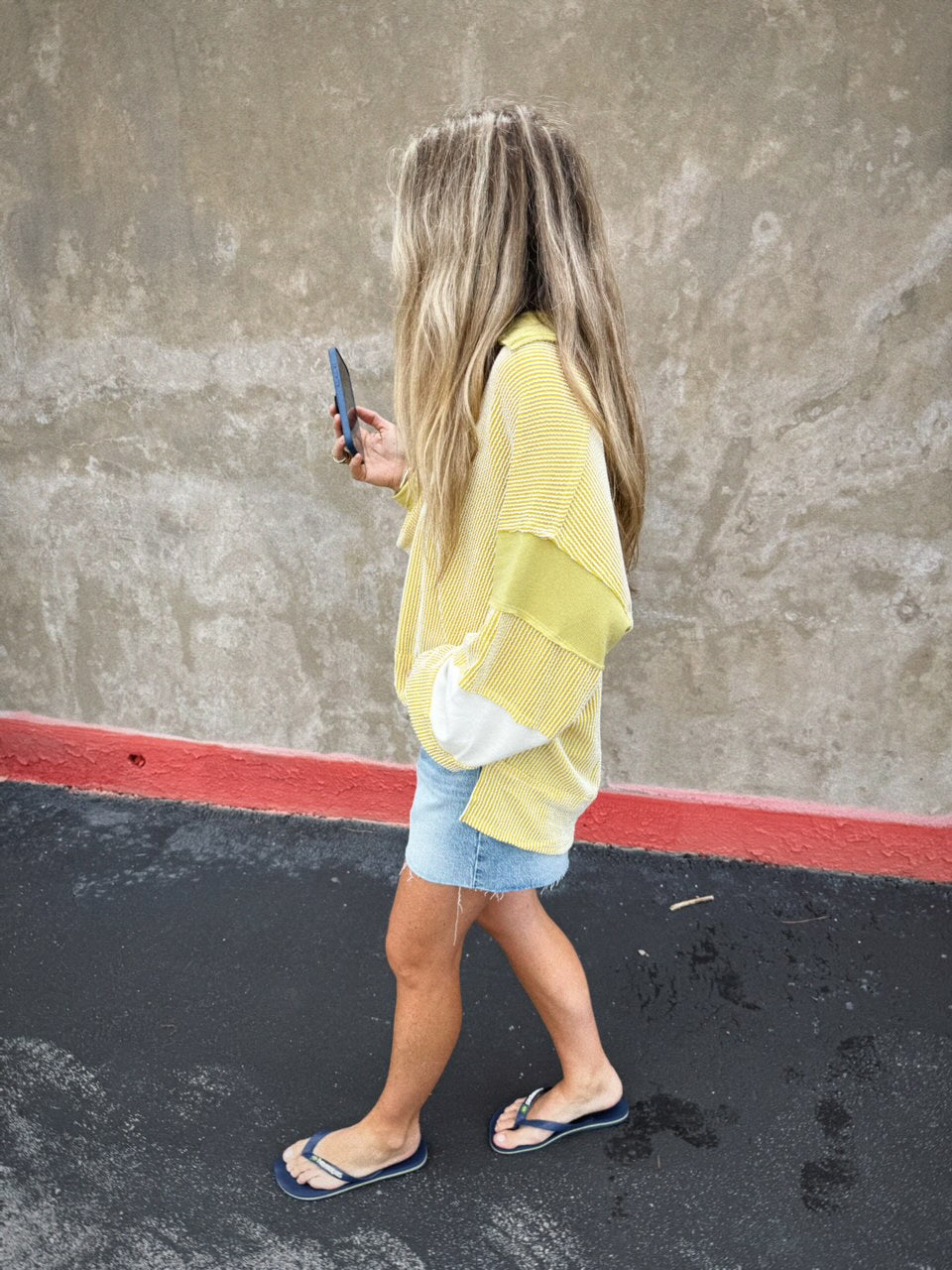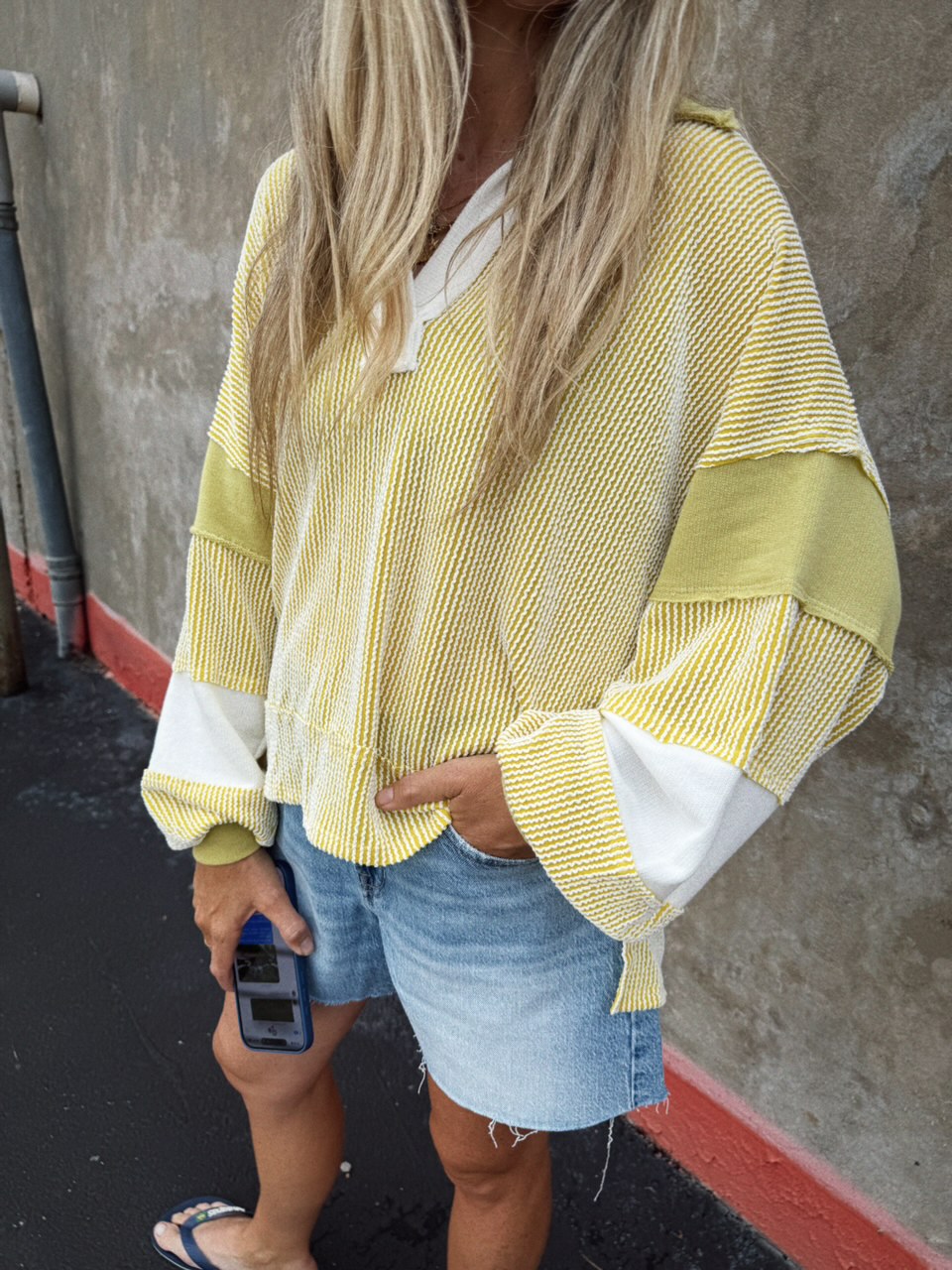 This loose fitting top features a ribbed knit design with a big collar and Henley style neckline. The long dolman sleeves add a relaxed feel while the contrast color blocking and raw edge details add a quirky touch. This top is over sized for a comfortable and playful fit.
