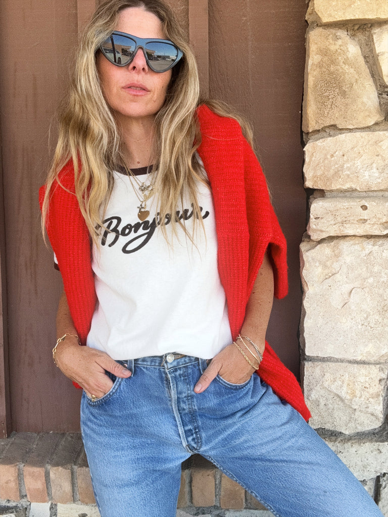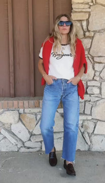 Add a playful French twist to your casual wardrobe with this “Bonjour” ringer tee. Crafted from soft cotton, it features contrast ribbed trim at the neckline and sleeves for a sporty, retro feel. Perfect for pairing with jeans, shorts, or skirts for an effortlessly chic look. -Embroidered "Bonjour" lettering at front -Contrast binding on neck and sleeve hems -Regular fit 100% Cotton