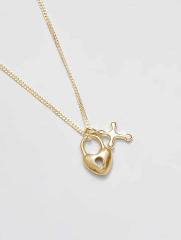 • 18" 14k Gold vermeil curb chain • 14k Gold plated brass heart lock and cross charms
